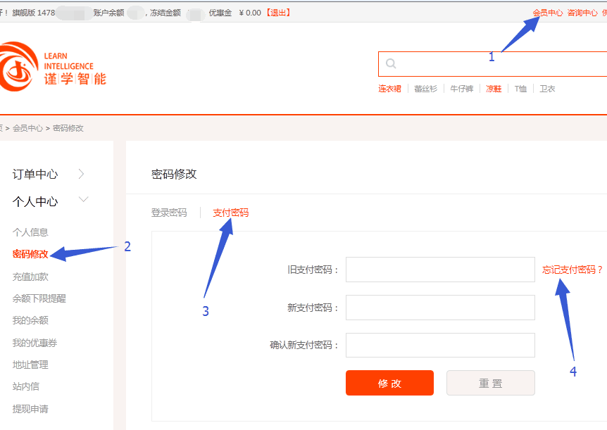 谨学官网,点击右上角会员中心——左侧个人信息——密码修改——支付密码——忘记密码进入按提示填写即可找回。